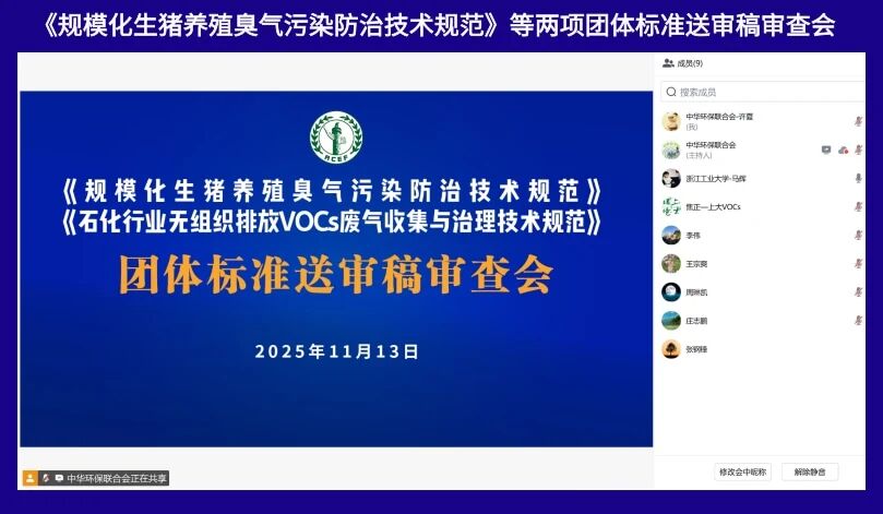 2025年11月13日,中华环保联合会在北京以视频会议形式组织召开两项团体标准送审稿审查会。会议依据国标委、民政部《团体标准管理规定》及《中华环保联合会团体标准管理办法(试行)》相关要求,对浙江工业大学牵头编制的《规模化生猪养殖臭气污染防治技术规范》《石化行业无组织排放VOCs废气收集与治理技术规范》进行了技术审查。专家组重点围绕标准适用范围、术语定义及关键参数设计依据等核心内容深入研讨,提出多项建设性意见与专业建议,为标准的进一步完善提供了重要技术支撑。
